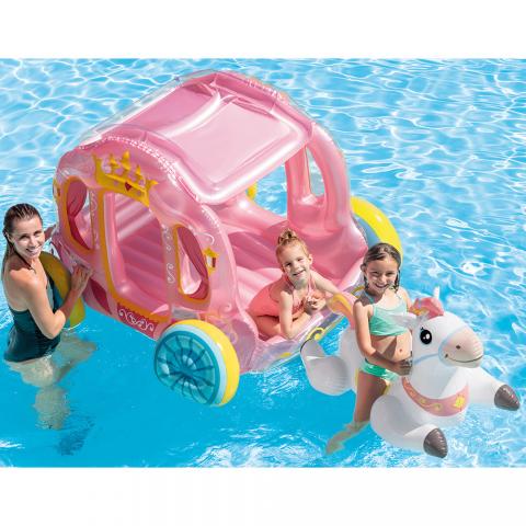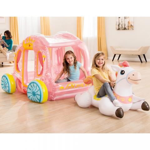 Διαστάσεις αλόγου (φουσκωμένο) 1.24m x 58cm x 66cm Πλαστικό 0.30mm Μαγευτική περλέ-ροζ άμαξα Κατάλληλο για εσωτερικούς και εξωτερικούς χώρους Μπάλωμα