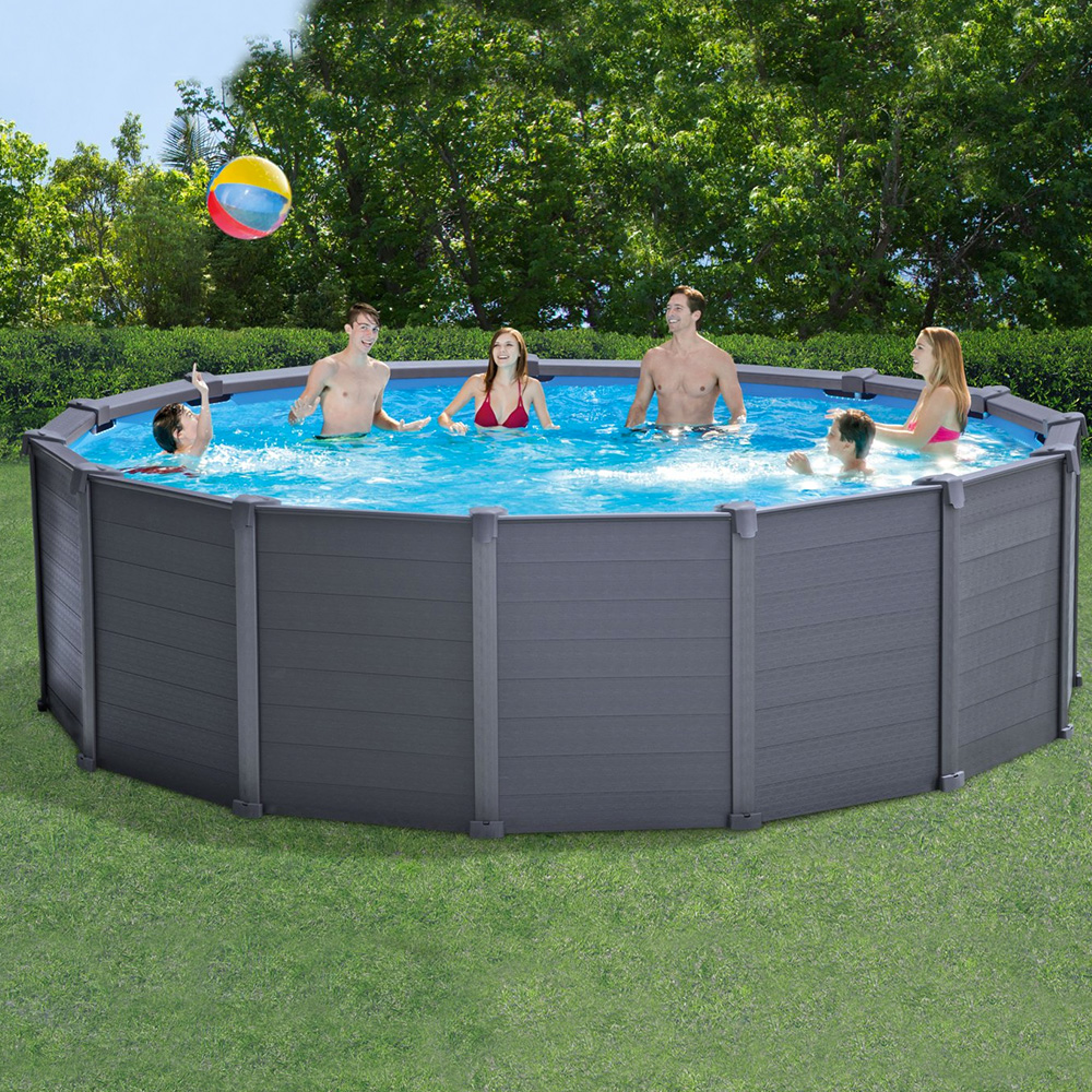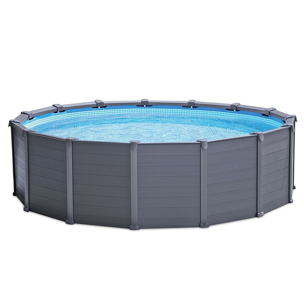 Following the latest color trends in exterior decking, The Graphite Gray Panel offers the apearence of a high end custom build swimming pool at a value that you can only expect from INTEX. The panels have the look of natural wood and they are made of high density plastic. Graphite Pool is easy to assembly and comes equipped with Intex highiest pool accessories, including the Krystal Clear sand Filter.