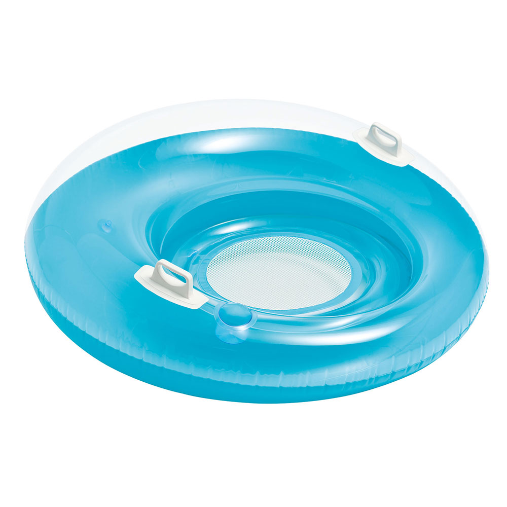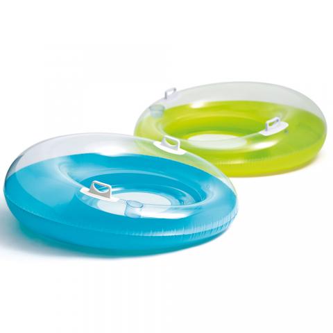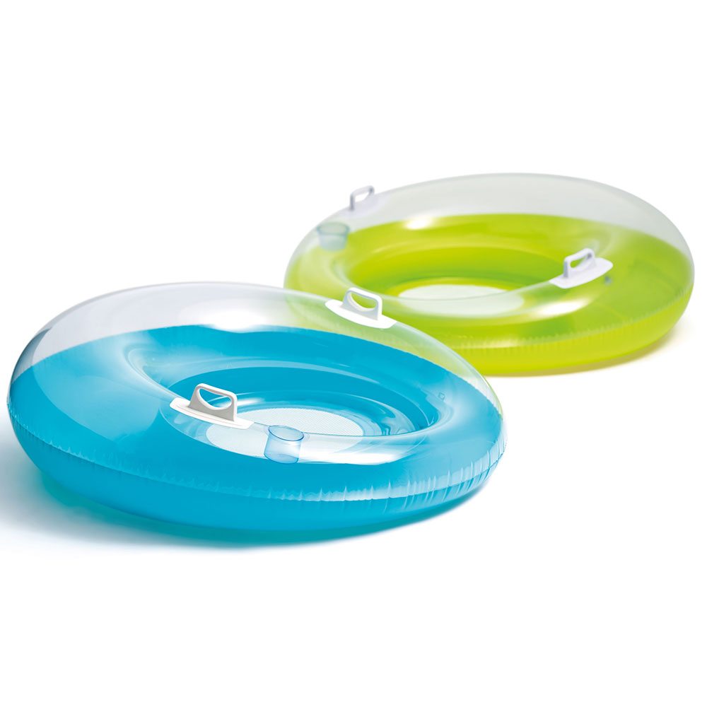 47 In. (1.19m) diameter 12ga (0.30mm) vinyl Clear top with blue and green bottom 2 air chambers 2 heavy duty handles One cup holder Repair patch