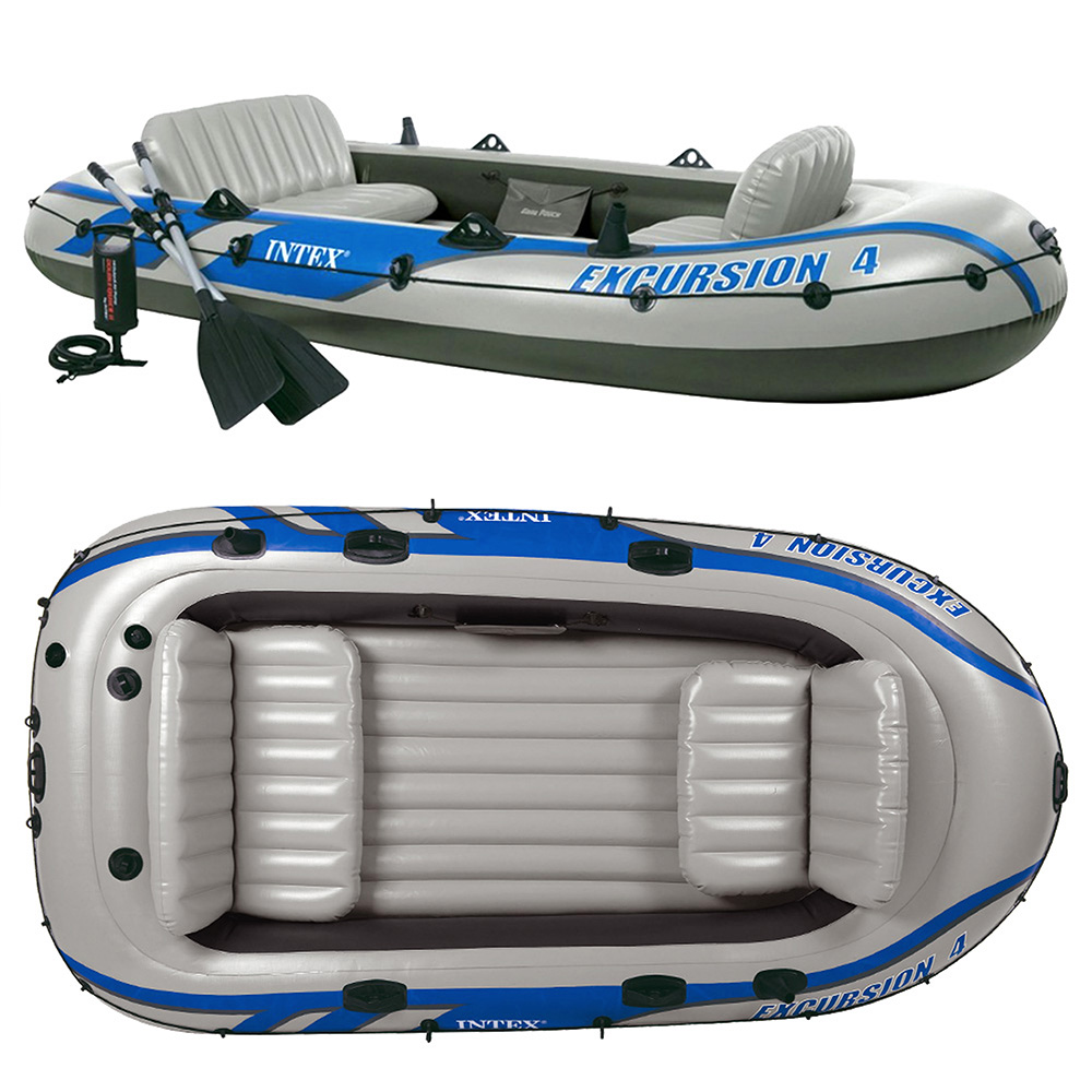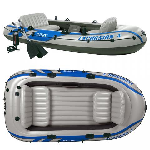 Excursion 4 Inflatable Raft Set With alluminium oars and pump 3 Boston valves for fast deflation and inflation Gear pouch, grab handles and oar holders Motor mount fittings 2 fishing rod holders Maximum load 400kg Repair patch